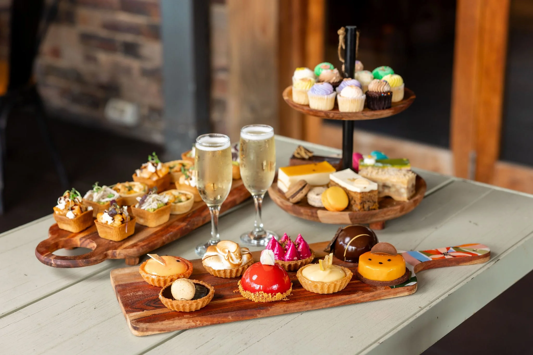Our High Tea spread features a delicious selection of bite-sized sandwiches, quiches and savouries, alongside an indulgent dessert table with macarons, cupcakes, slices, lemon meringue tarts, custard tarts, chocolate cake and more.